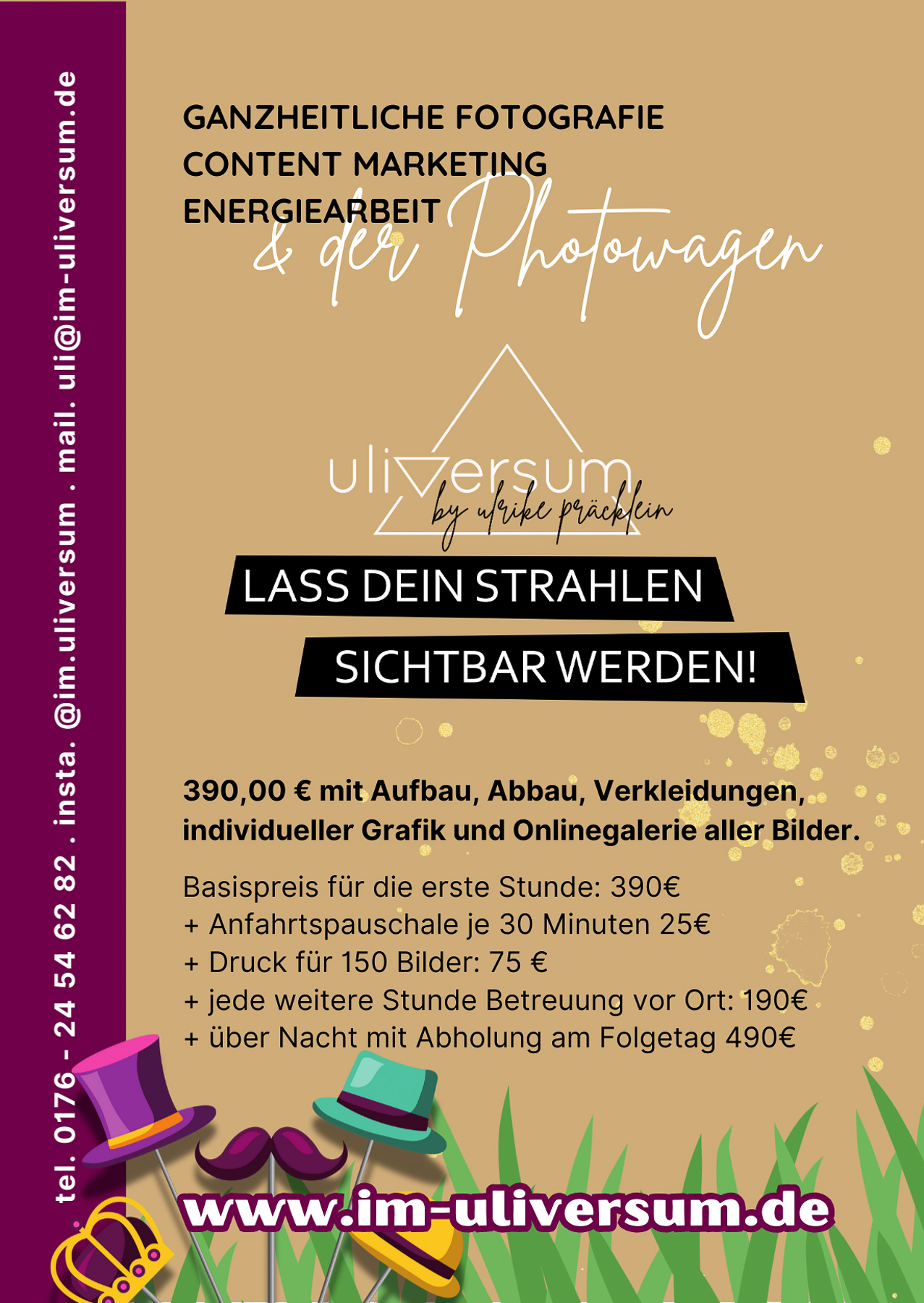 Ob Hochzeit, Geburtstag, Firmenfeier oder Sommerfest – der Photowagen bringt Stimmung, Spaß und unvergessliche Bilder. Mit Liebe eingerichtet, voll ausgestattet und bereit, eure schönsten Momente festzuhalten.
